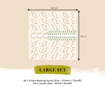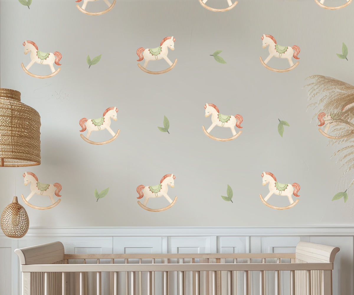 These Rocking Horse wall decals bring a soft, storybook charm to nurseries and children’s rooms. Featuring gentle rocking horses paired with delicate leaves, they create a calm and whimsical atmosphere perfect for little dreamers. Style them spaced out for a light, airy look or arrange them closer together for a playful pattern.