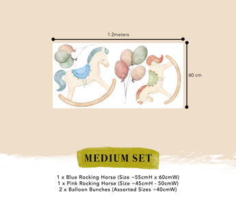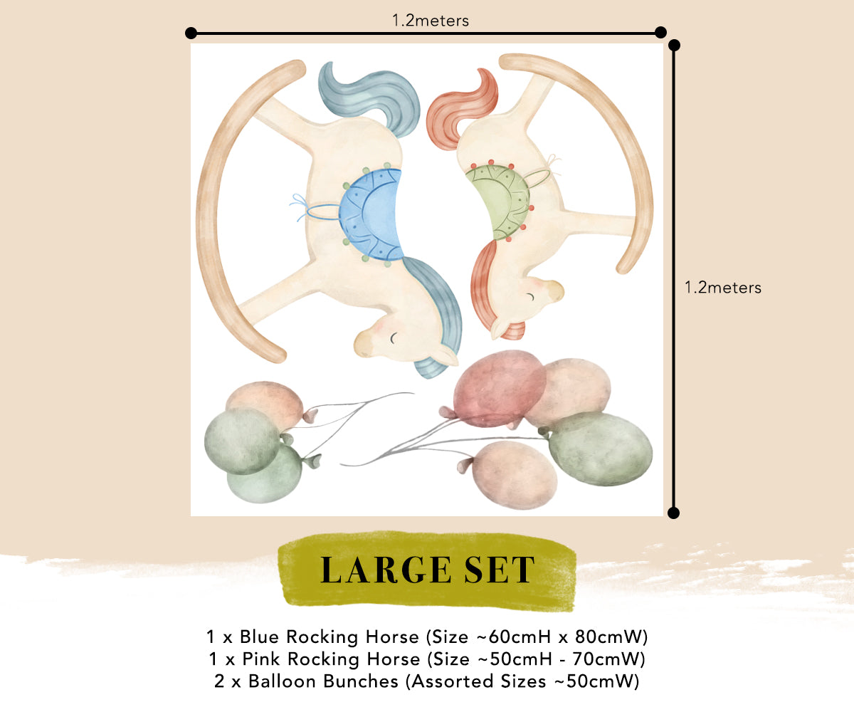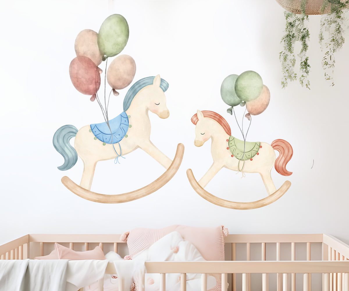 This Rocking Horse Wall decals bring a charming, storybook feel to nurseries and children’s rooms. Featuring gentle rocking horses with soft colours and floating balloons, they create a sweet and dreamy focal point above cribs or beds.