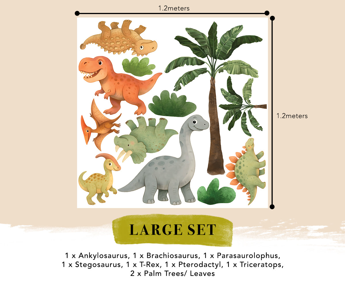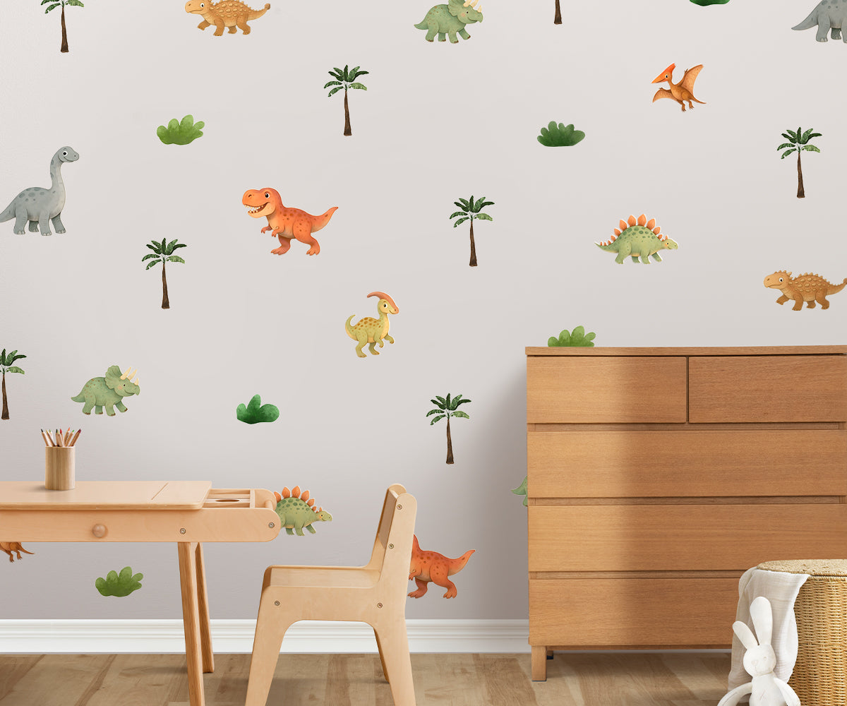 Step back in time with this playful Dinosaur wall decal set, perfect for young dino enthusiasts! Featuring friendly and colorful dinosaurs like T-Rex, Triceratops, Brachiosaurus, Stegosaurus, and more, along with lush greenery, it brings a prehistoric adventure to any room. With its cheerful expressions and vibrant design, this set transforms walls into a fun, imaginative Jurassic world.