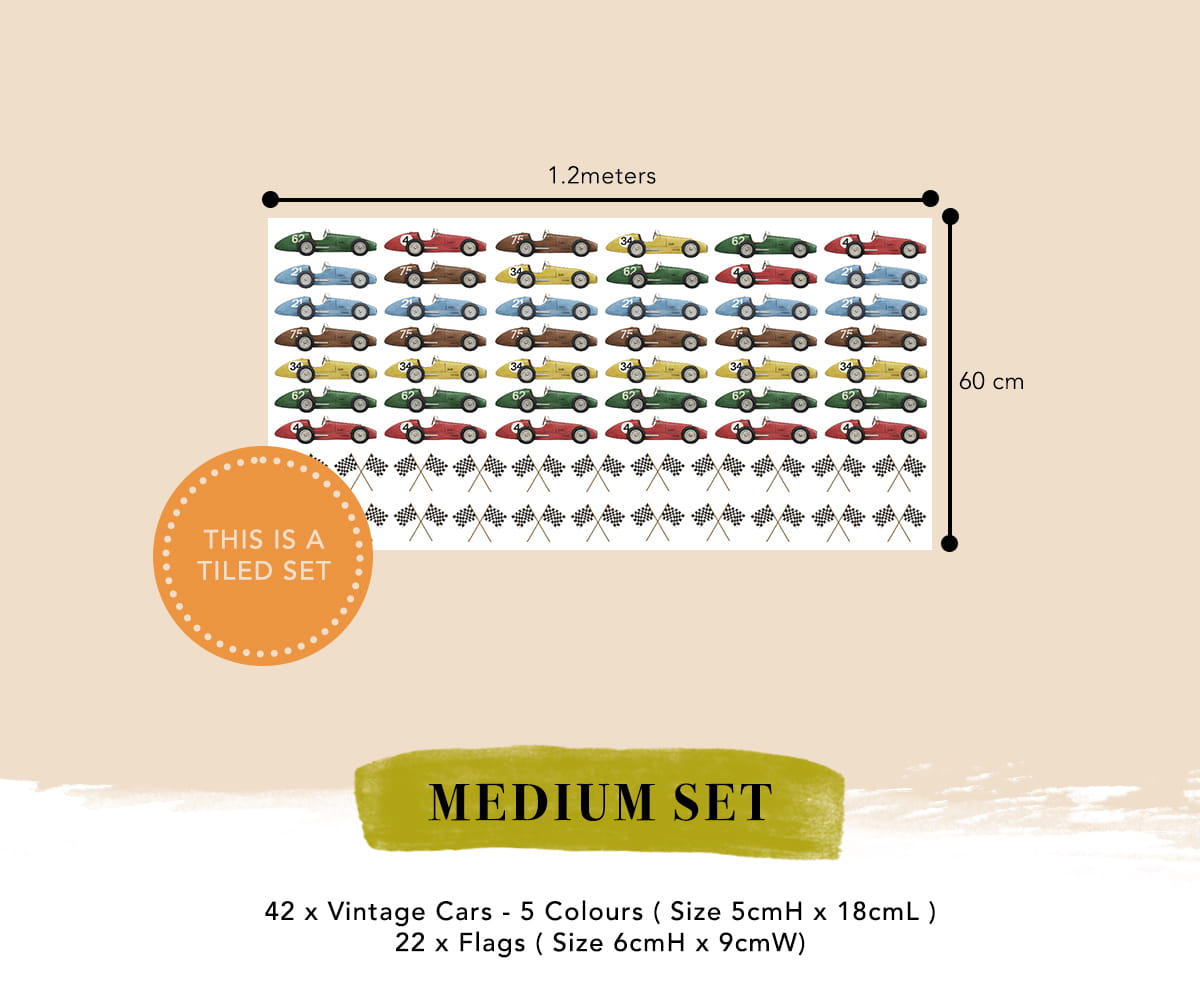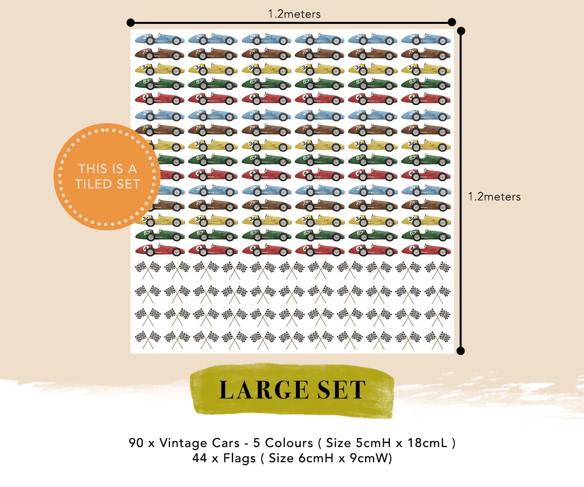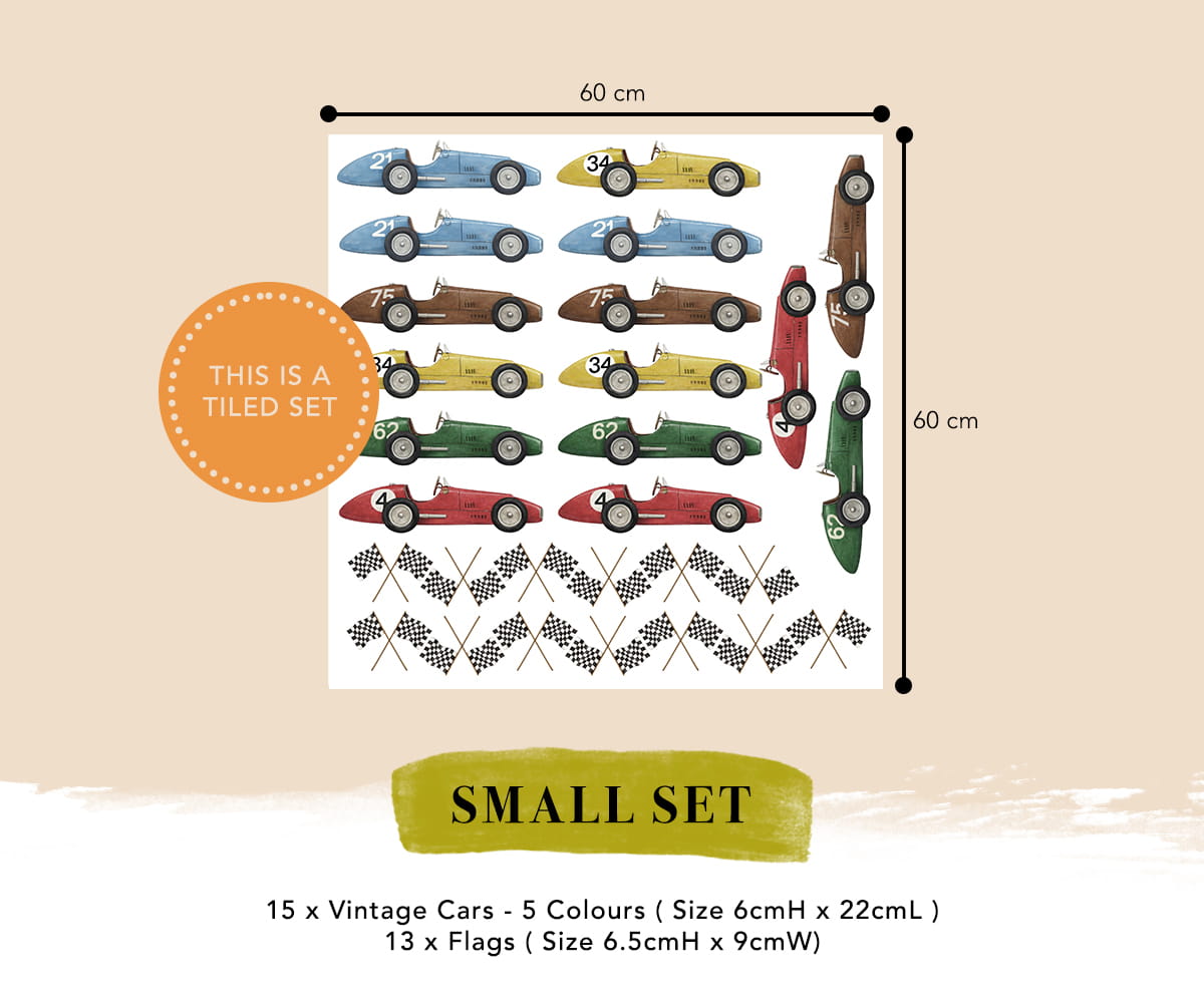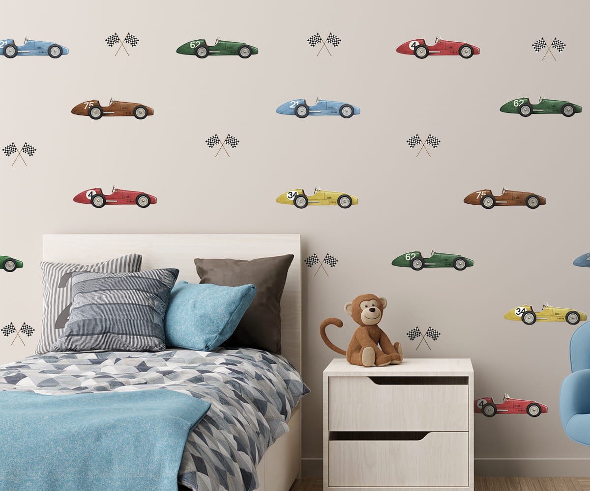 These vintage racing cars wall decals bring a sense of adventure and classic charm to your child’s room. Featuring timeless race car illustrations and playful checkered flags, they add movement and personality without overpowering the space. Style them spaced out for a relaxed, playful look or closer together for a fun race-day feel. Easy to apply, removable, and gentle on walls, they’re perfect for little car lovers and growing imaginations.